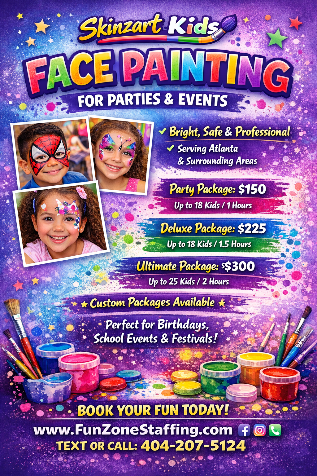 * Before CheckOut Make Sure To Add Additional Facepainter, If Needed or Required(This Is The Only Way SkinzArtKids Will Know How To Staff For Your Booking)